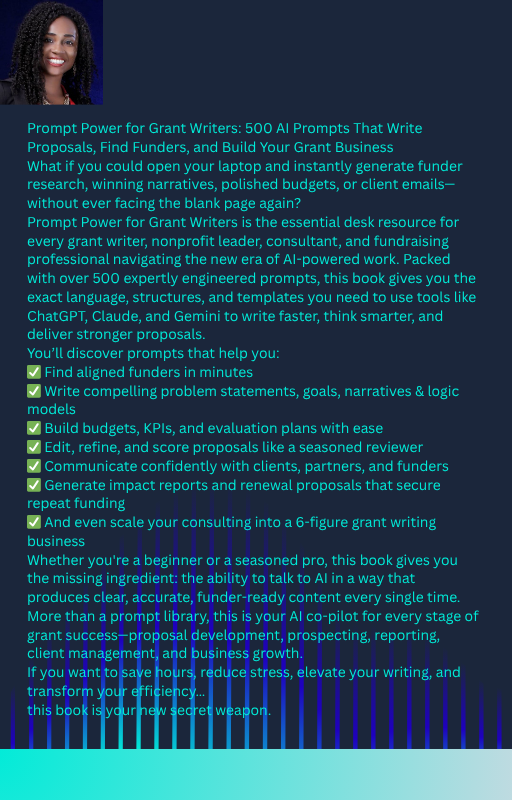 Prompt Power for Grant Writers is your step-by-step guide to using ChatGPT and AI tools to boost clarity, speed, creativity, and professional polish in every application.